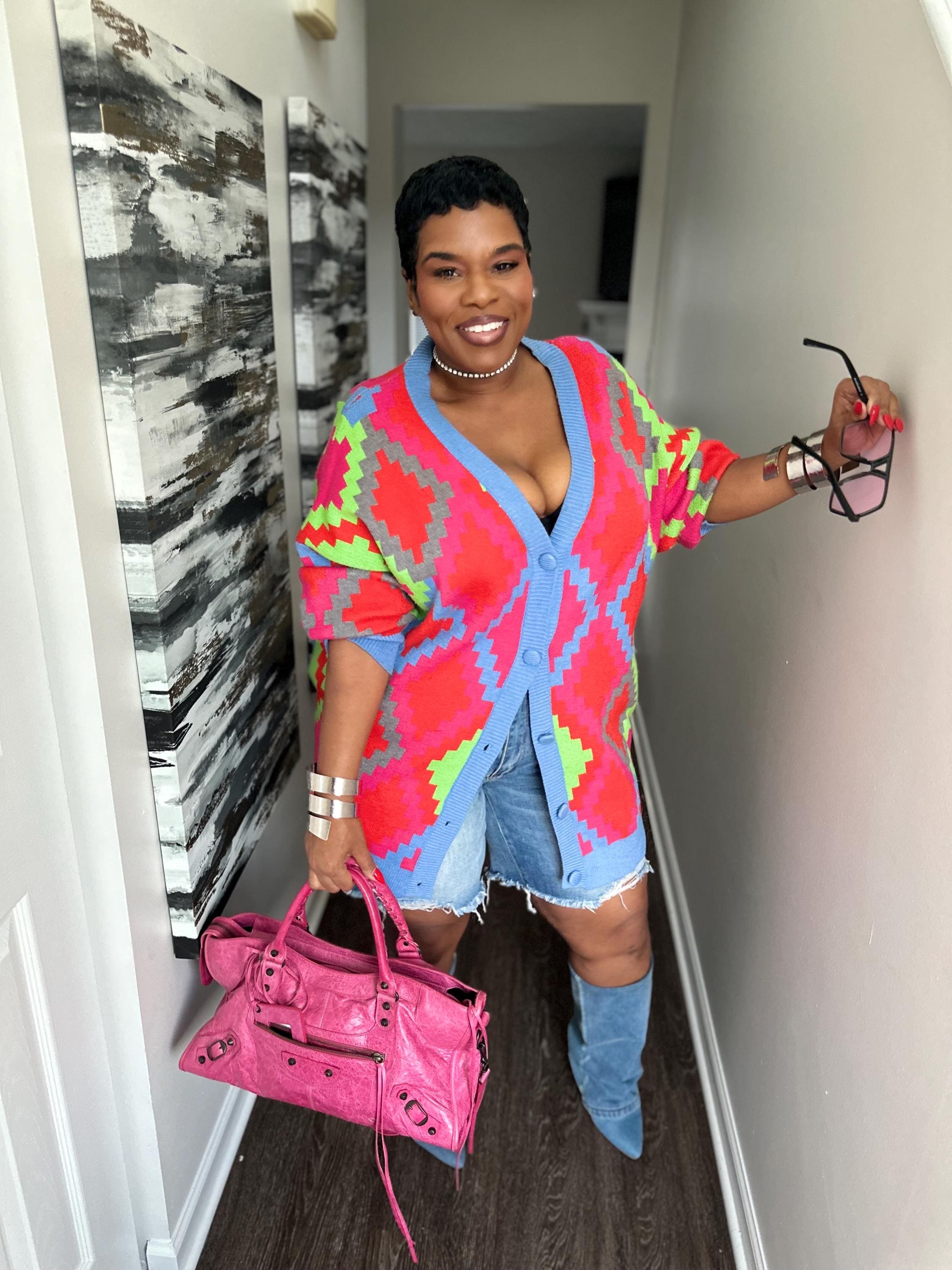 Model wearing a 1x in cardigan this item fits oversized see size chart attached. i recommend sizing down in this item.