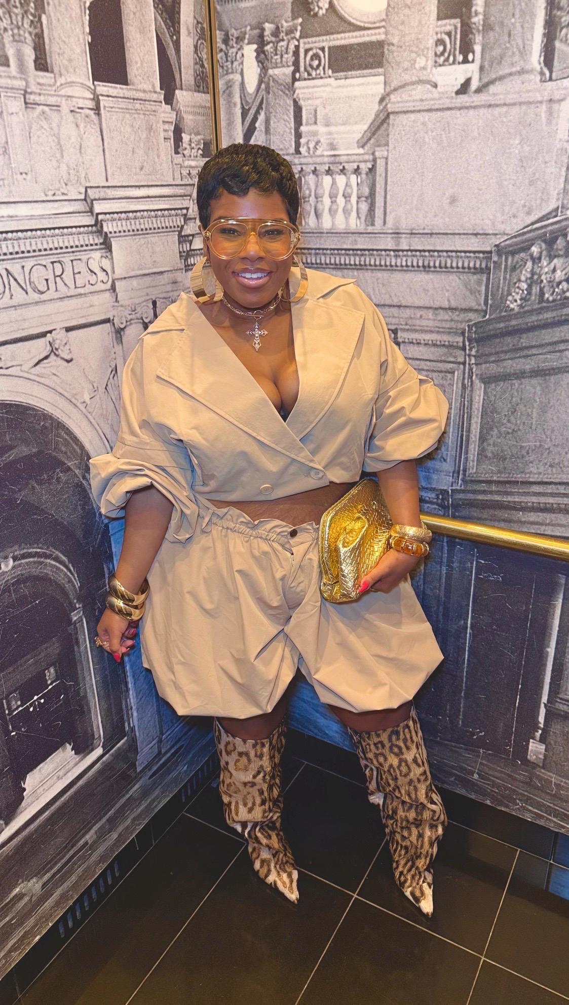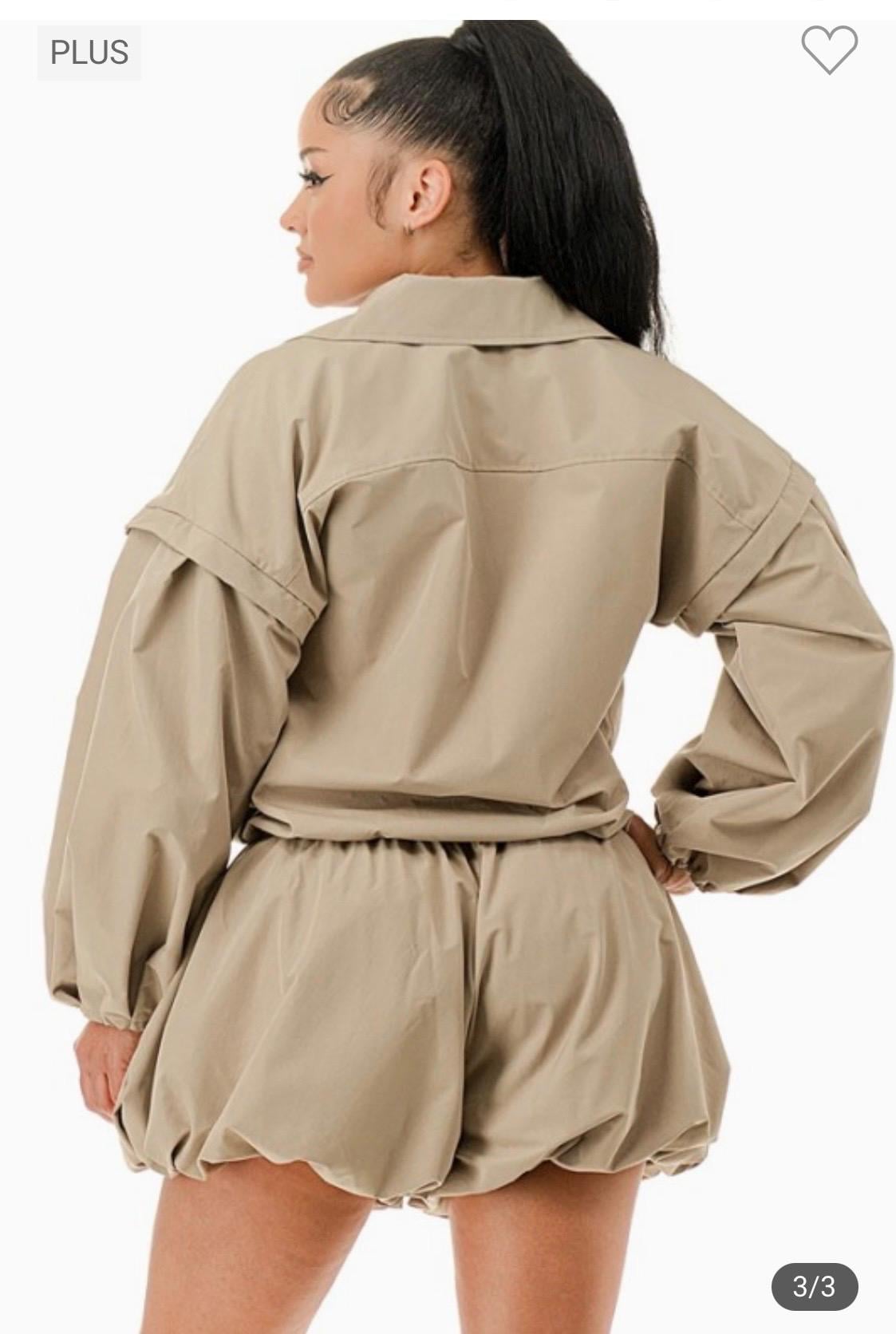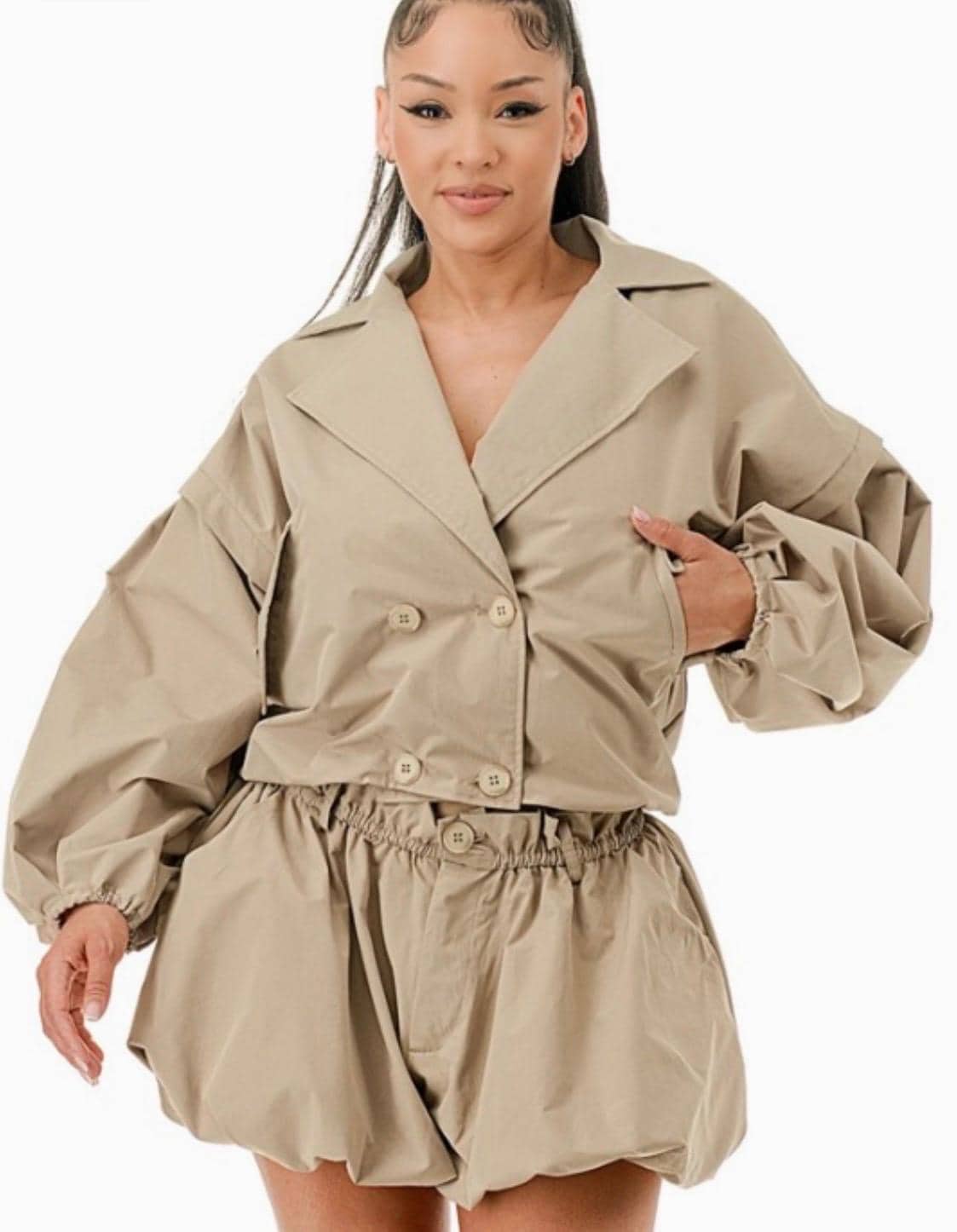 This set fits Oversized. This set includes a cropped blazer and matching bubble shorts.